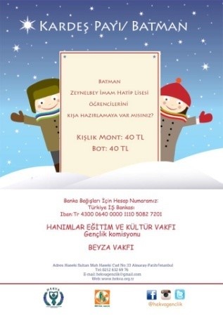 2016 yılı Aralık ayında bu defa Batman Zeynelbey İmam Hatip Lisesi öğlecilerini kışa hazırladık. Hollanda’da faaliyet gösteren Beyza Vakfı ile ortaklaşa yürütülen “Kardeş Payı Batman” kampanyamızda öğrencilerin bot ve mont ihtiyaçları karşılanmıştır.