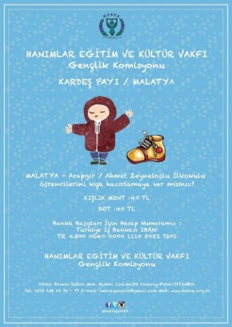 HEKVA Gençlik, 28 Ekim 2016 tarihinde Ahmet Zeyneloğlu İlkokulu’nun 144 öğrencisinin kış aylarında üşümemeleri için yola çıkarak “Kardeş Payı Malatya” kampanyasını gerçekleştirmiştir. Bu kampanya ile öğrencilerin bot ve mont ihtiyaçları karşılanmıştır.
